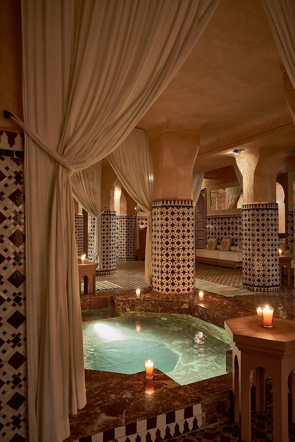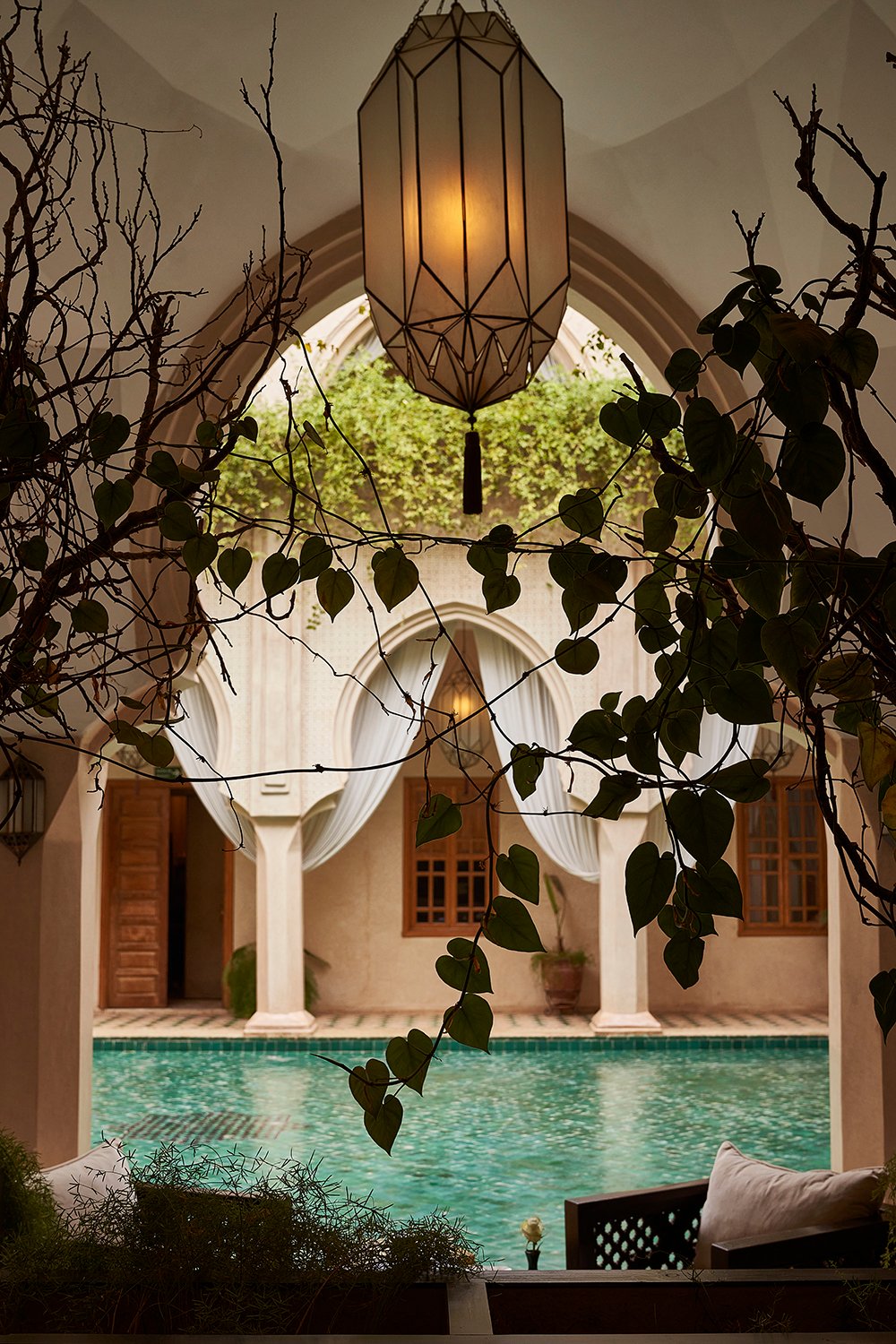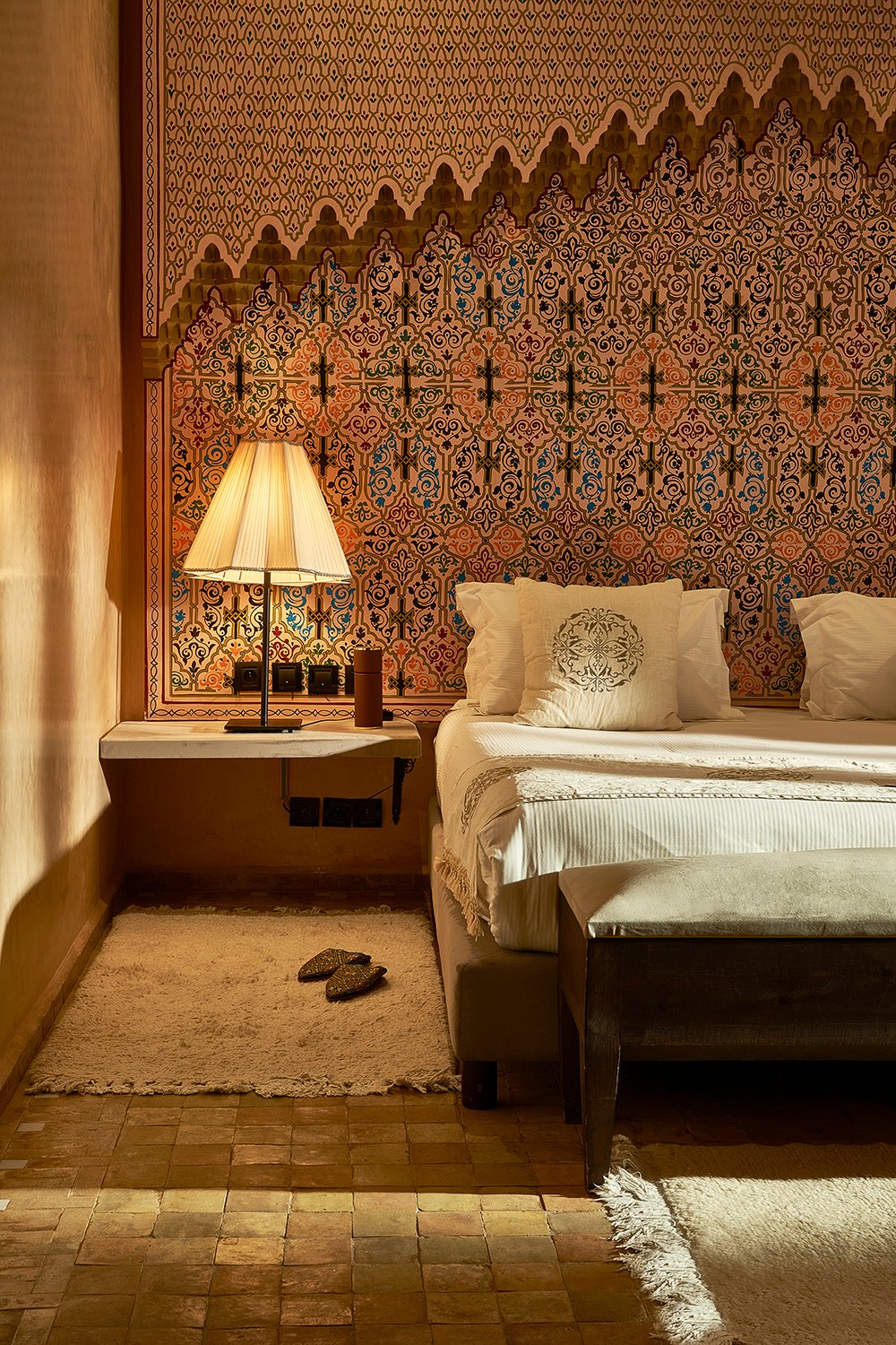 From the terrace, the view stretches across the rooftops of the Medina all the way to the distant Atlas Mountains. It's especially striking at sunset in Marrakech, when the sky shifts from warm gold to deep amber, creating quiet moments that define a stay in the city. As evening falls, the atmosphere becomes softer, lit by candles and the gentle glow of the city.